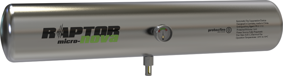 El Raptor micro-nova es un sistema autónomo de detección y extinción de incendios especialmente diseñado para proteger cuadros eléctricos, paneles de control y pequeños compartimentos técnicos. Su diseño compacto y discreto permite una integración sencilla, incluso en espacios reducidos, garantizando una protección eficaz sin necesidad de energía externa ni mantenimiento periódico.